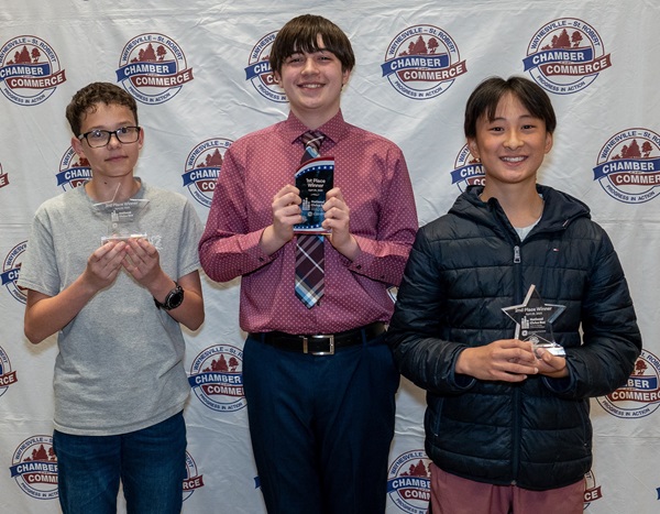 The event, held at the Parker Educational Center in Waynesville, with David Lowe as the emcee. Awarded the top three finalists of the local competition: Brandon Bullard from Waynesville Middle School (1st place), Charlie Fan from Ladue Middle School (2nd place), and Grant Good from Waynesville Middle School (3rd place).
