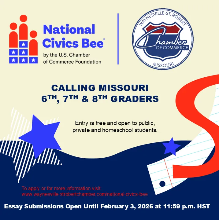 The Waynesville-St. Robert Chamber of Commerce is proud to partner with the U.S. Chamber of Commerce Foundation to bring the National Civics Bee to Pulaski County, MO for the 2025-2026 program year. This annual initiative – now expanding to all 50 states in celebration of America’s 250th anniversary in 2026 – invites middle school students to showcase their civics knowledge, engage in their communities, and build trust in others and institutions through a nonpartisan, multi-round competition. Due to the widespread impact of the winter storms, including school closures, postal service delays, and power and internet outages, we are implementing a one-time, nationwide extension of the 2026 essay submission deadline. The new deadline is: Tuesday, February 17, 2026, at 11:59 p.m., Hawaii Standard Time.