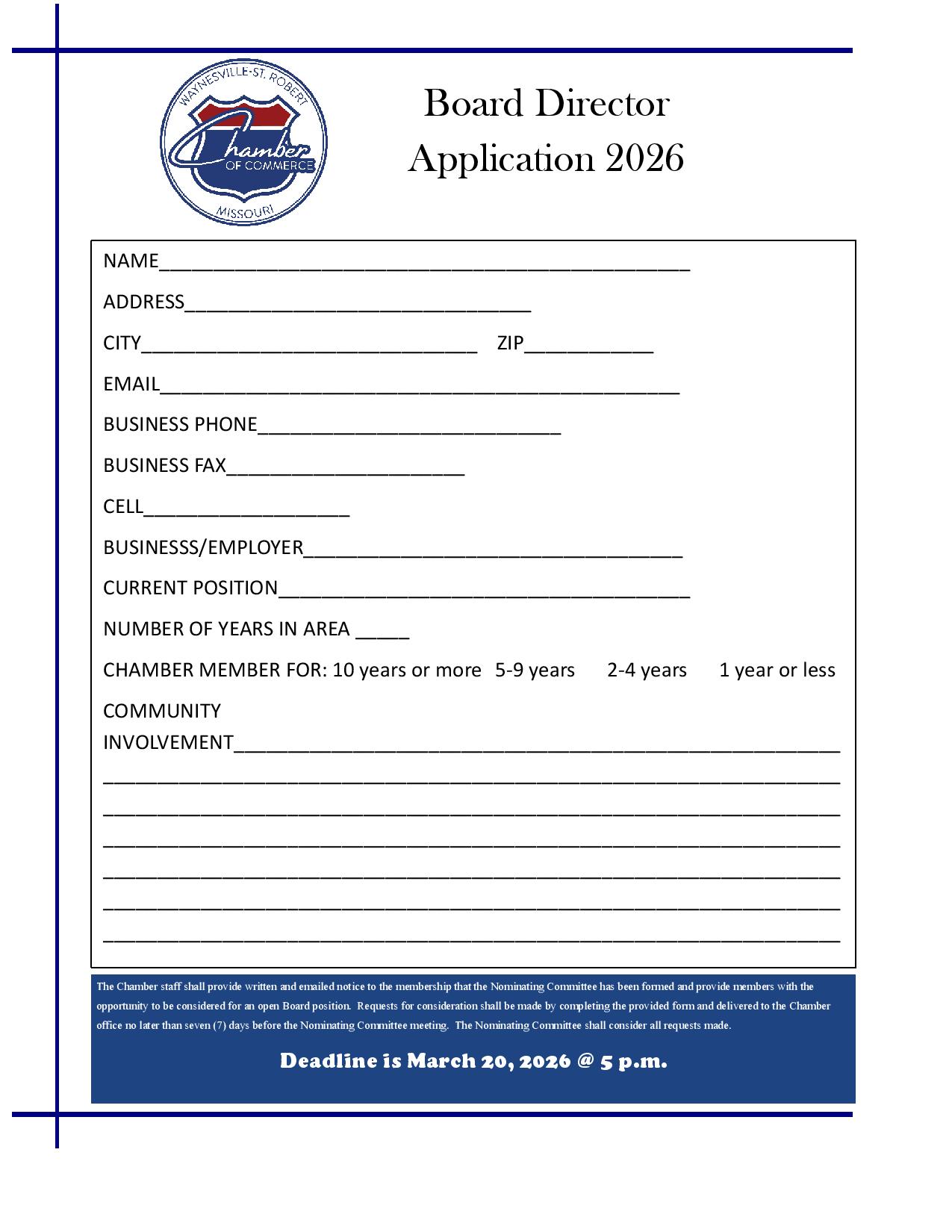The Waynesville - St. Robert Chamber of Commerce Board of Directors announces the opportunity for members in good standing to be considered for open board positions for the term of 2026 - 2029. There are four open board seats, three in Waynesville and one Membership at Large. The location of a candidate’s place of business, (place of residence if he/she has no place of business), at the time of the election shall be used to determine whether the candidate is from the Waynesville area, from the St. Robert area, or from the immediate area outside the cities. For this purpose, the St. Robert area shall include all territory west of the eastern city limits of the City of St. Robert, the Waynesville area shall include all territory west of the eastern city limits of the City of Waynesville, and the immediate area within a ten (10) mile radius of both cities’ boundary lines shall include all territories. Requests for consideration shall be made by completing the application form and delivering the completed form to the Chamber office no later March 20th at 5 p.m. The Nominating Committee shall consider all requests made. Contact Cecilia at chamberdirector@wsrchamber.com with any questions.