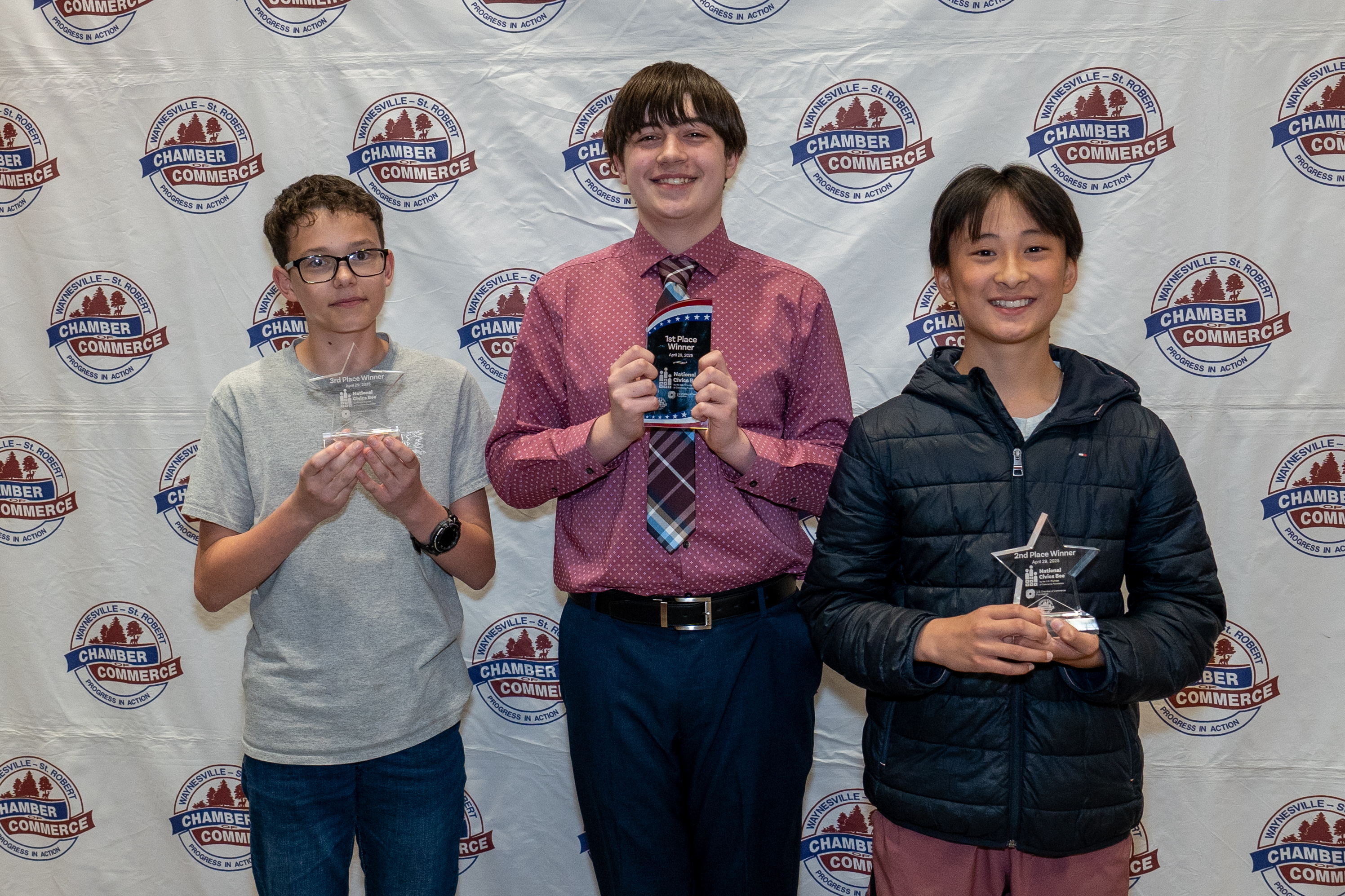 The event, held at the Parker Educational Center in Waynesville, with David Lowe as the emcee. Awarded the top three finalists of the local competition: Brandon Bullard from Waynesville Middle School (1st place), Charlie Fan from Ladue Middle School (2nd place), and Grant Good from Waynesville Middle School (3rd place).